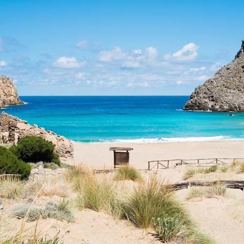 Cala Domestica beach is a bay set between limestones cliffs covered with Mediterranean scrub and characterised by fine sand mixed with gravel and scattered rocks. Behind the beach there are sand dunes and the ruins of warehouses belonging to nearby mines. The sea has a shallow depth and a beautiful blue colour that can be appreciated especially on calm days.