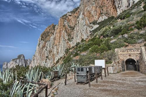 Porto Flavia is a sea harbour located on the coast of Nebida in southwestern Sardinia. It was opened in 1924 and at that time it was a true revolution: a modern tunnel system for transporting minerals from Masua and nearby mines directly into the ships moored under the cliff, reducing the time and cost of transportation. It is named after Flavia Vecelli, the daughter of Cesare Vecelli, who engineered and designed the harbour. Its unique architecture, combined with the beautiful blue waters, white cliffs perfect for climbing and the view of Europe's tallest sea stack, called Sugar Loaf, creates a picturesque and memorable scenery that you absolutely must visit.